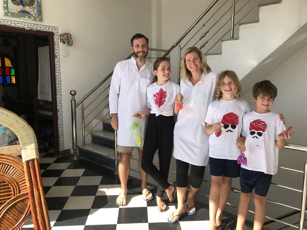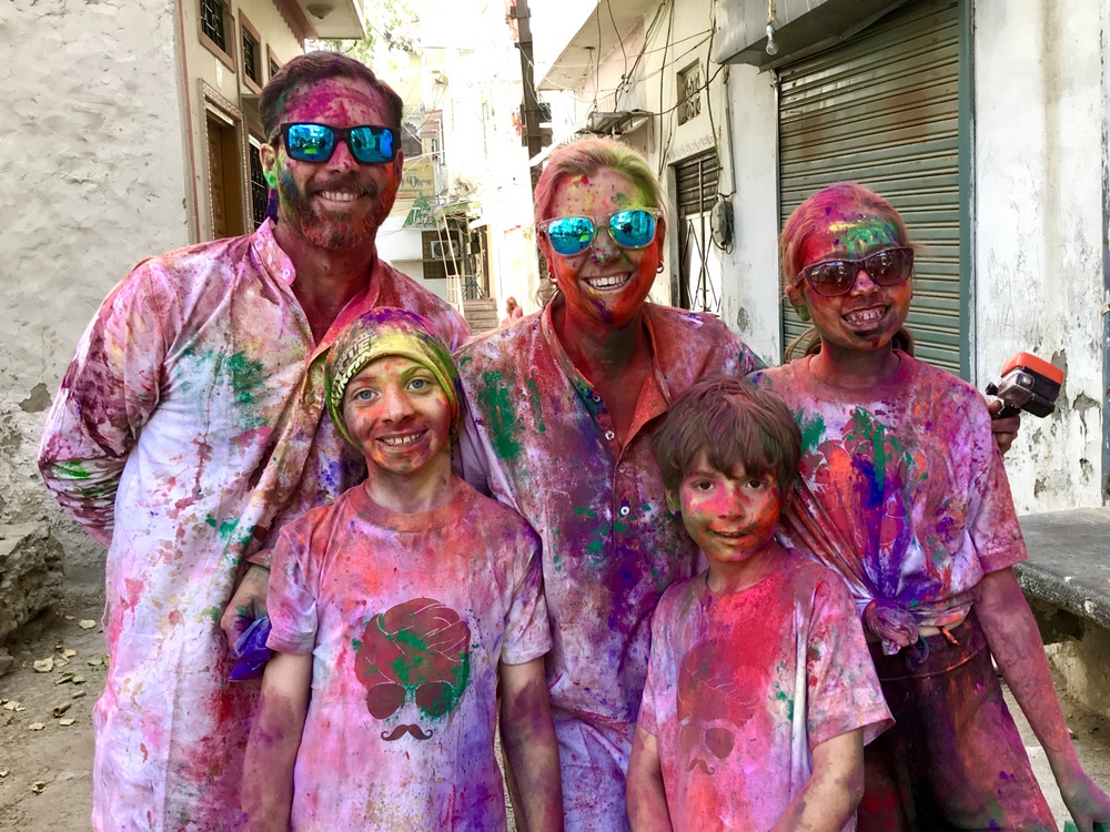 I can’t say if Holi with kids is safe, but I can tell you that we felt perfectly safe celebrating Holi on the streets of Udaipur. We talked to our kids about what to expect and listened to them when they were done with it and wanted to go back to the guesthouse. It can be very intense for kids with the powder, loud noises, and constant requests for selfies. Each child will respond to it differently, but our kids loved the experience.