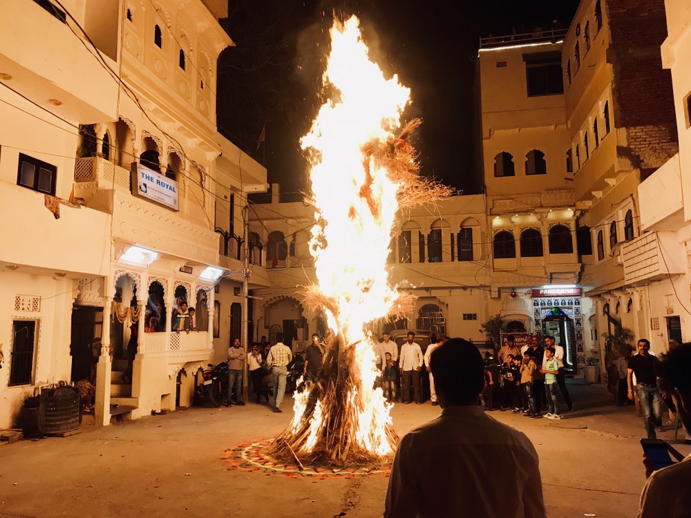We stayed at the Panorama Guesthouse, which was one of our favourite places to stay in Rajasthan. In addition to having cute budget rooms and a great rooftop restaurant with views of the lake, it is located in a local area with Holika Dahan celebrated right on your doorstep.